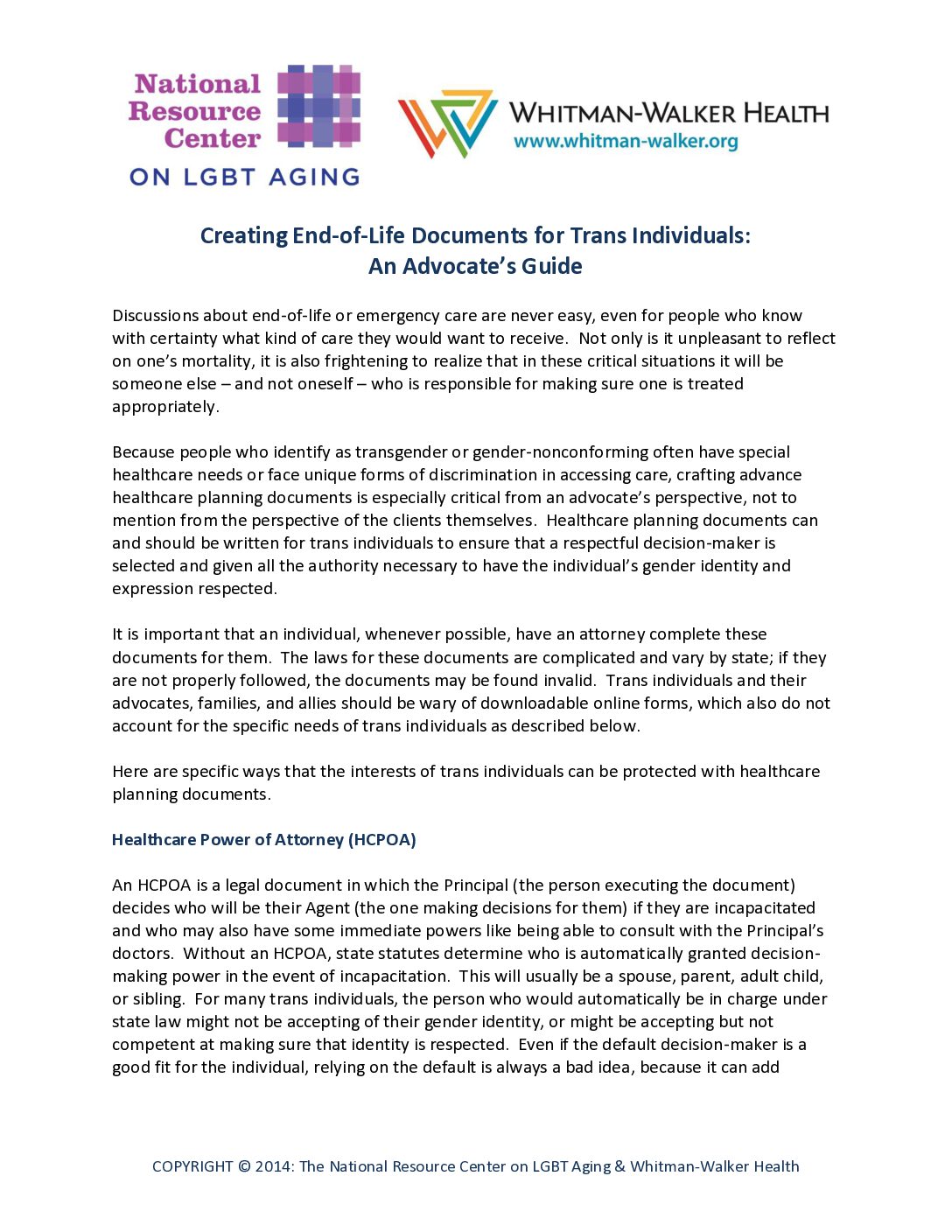 “Because people who identify as transgender or gender-nonconforming often have special healthcare needs or face unique forms of discrimination in accessing care, crafting advance healthcare planning documents is especially critical…”