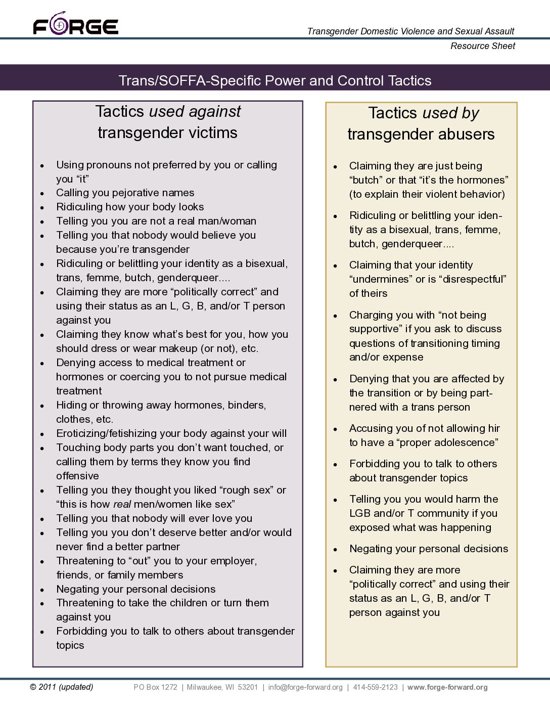 This short document lists trans-specific power and control tactics that can be used against and by trans people in couple relationships.