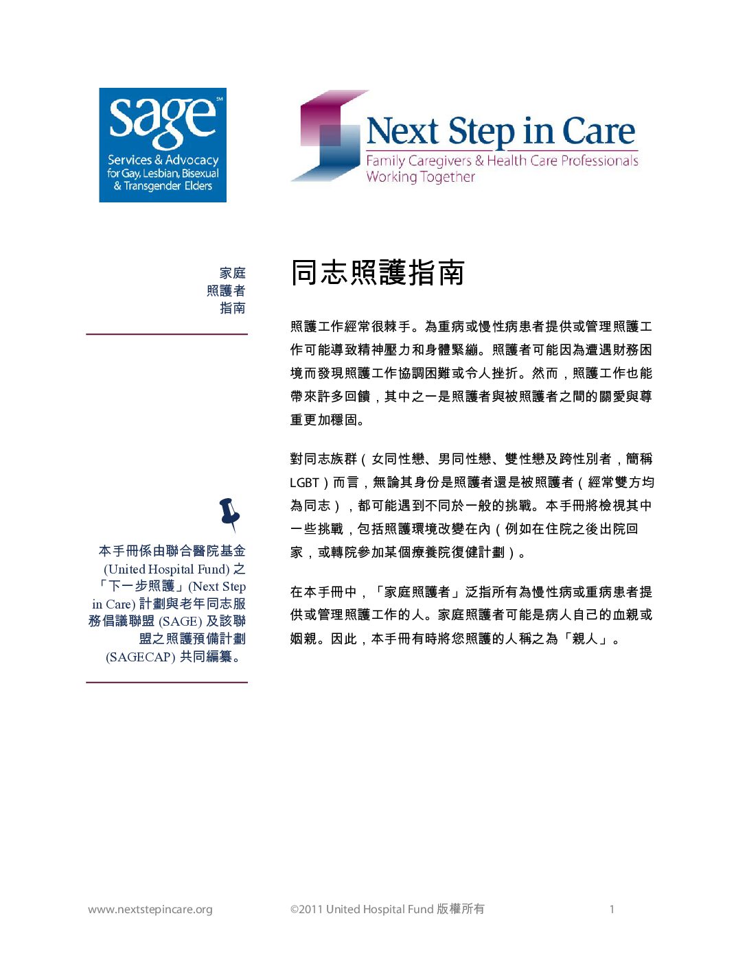 This guide, written in Chinese, examines the issues that arise in LGBT caregiving, as LGBT individuals may encounter special challenges whether they are acting as caregivers or are the ones in need of care.