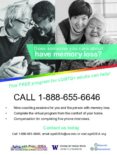 A person with memory loss and their care partner participate in the study as a pair. The care partner can be a spouse, partner, friend, adult child or anyone who assists the person with memory loss. At least one of them must be LGBTQ. The person with memory loss must be age 50 years or older. The pair do not need to live together but they must live in the U.S.