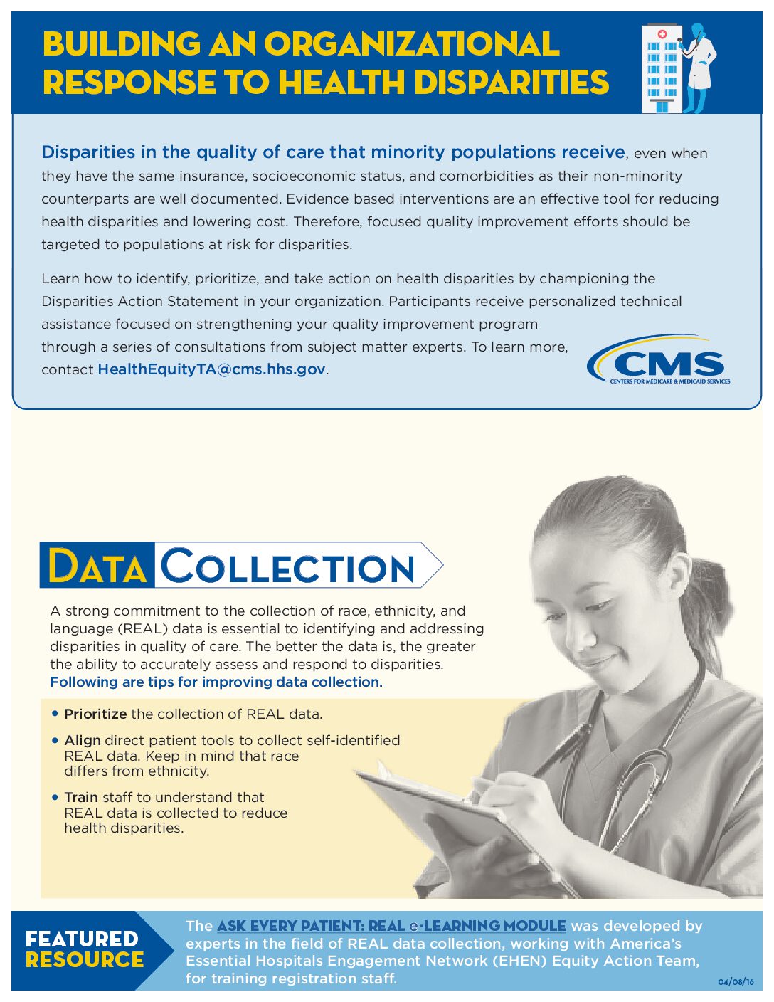 This fact sheet provides resources on how to identify, prioritize, and take action on health disparities by championing the Disparities Action Statement in your organization.