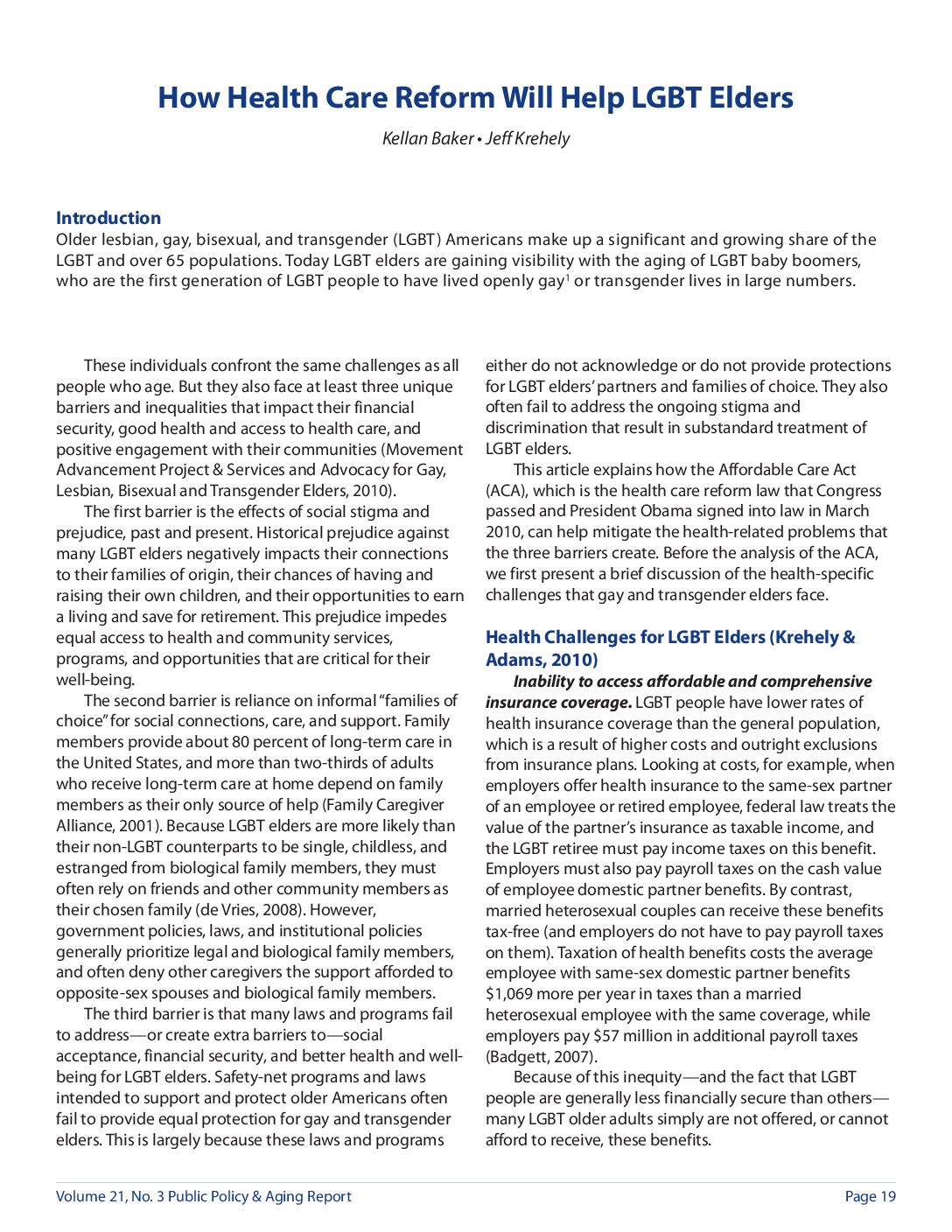 This article, written by Kellen Baker and Jeff Krehely (Center for American Progress), examines how health care reform will help LGBT older adults.