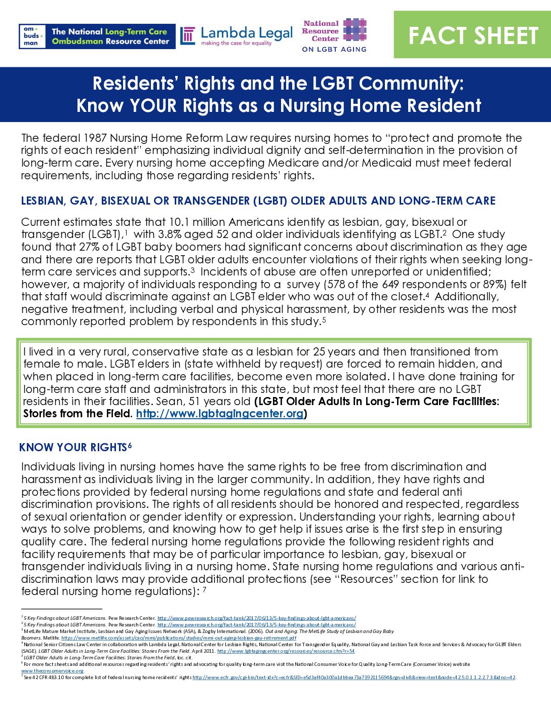 The rights of all residents should be honored and respected, regardless of sexual orientation or gender identity or expression. This fact sheet provides and overview of the federal 1987 Nursing Home Reform Law requires nursing homes to “protect and promote the rights of each resident” emphasizing individual dignity and self-determination in the provision of long-term care. Every nursing home accepting Medicare and/or Medicaid must meet federal requirements, including those regarding residents’ rights.