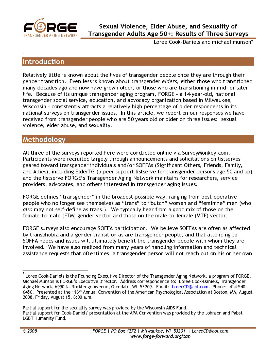 This article reports on three surveys of transgender older adults. One survey looked at their experiences about elder abuse, including what they viewed as “abuse.” The other relevant study looked at the sexual violence expriences of transgender people age 50 and up.