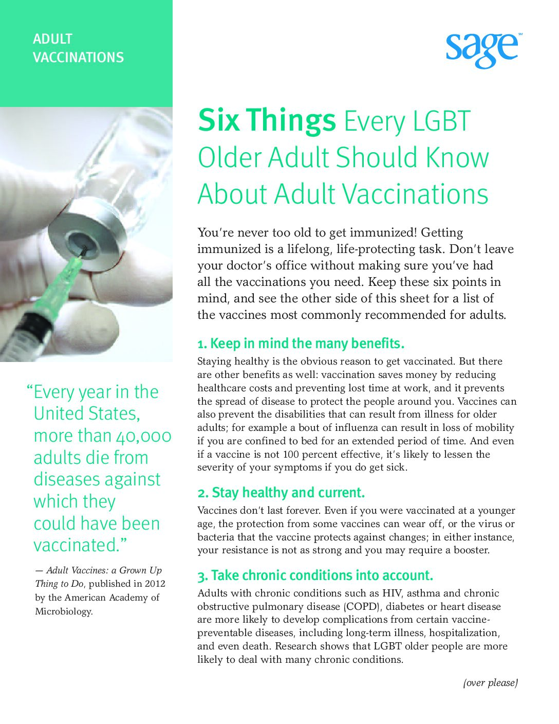 This fact sheet from Services & Advocacy for GLBT Elders (SAGE) highlights the importance of vaccinations for adults.