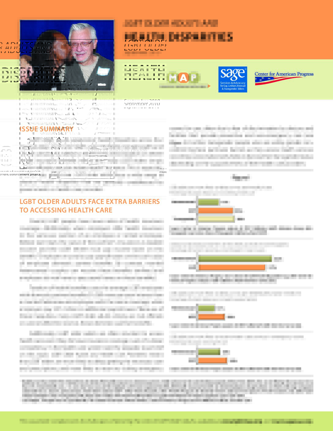 This brief documents the health disparities LGBT older adults face: health care insurance, access to health care, HIV/AIDS, mental health, and chronic conditions, which often results in delayed health care and overall poorer health.