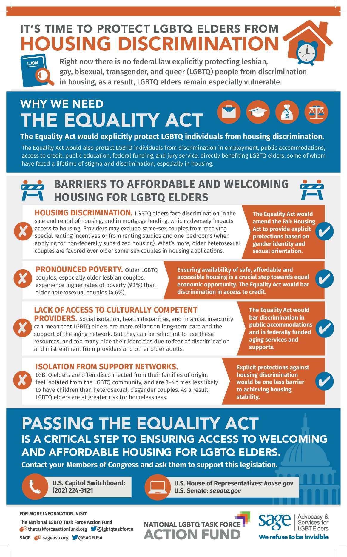 The Equality Act would also protect LGBTQ individuals from discrimination in employment, public accommodations, access to credit, public education, federal funding, and jury service, directly benefiting LGBTQ elders, some of whom have faced a lifetime of stigma and discrimination, especially in housing.