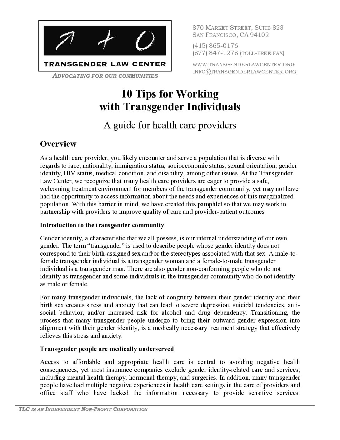 This tip sheet is intended for health care providers to become more culturally competent in working with transgender individuals. It includes ten suggestions for improving health services for transgender people as well as other resources which may be additionally helpful to health professionals.