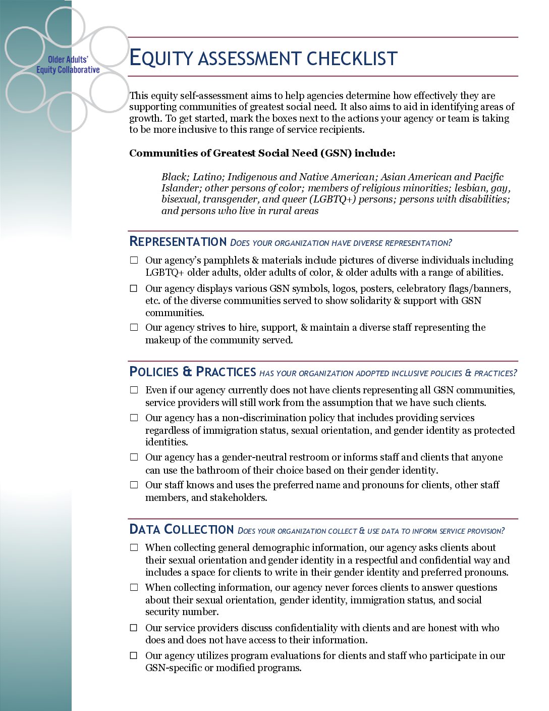 This equity self-assessment aims to help agencies determine how effectively they are supporting communities of greatest social need. It also aims to aid in identifying areas of growth. To get started, mark the boxes next to the actions your agency or team is taking to be more inclusive to this range of service recipients.