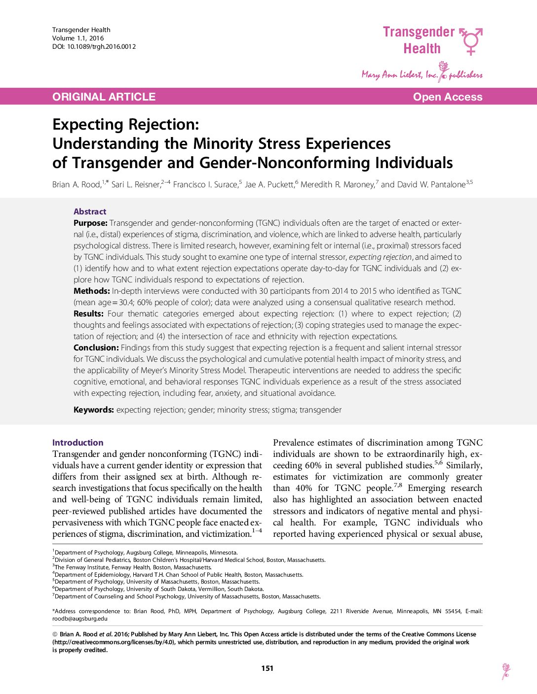 Findings from this study suggest that expecting rejection is a frequent and salient internal stressor for TGNC individuals. We discuss the psychological and cumulative potential health impact of minority stress, and the applicability of Meyer’s Minority Stress Model. Therapeutic interventions are needed to address the specific cognitive, emotional, and behavioral responses TGNC individuals experience as a result of the stress associated with expecting rejection, including fear, anxiety, and situational avoidance.