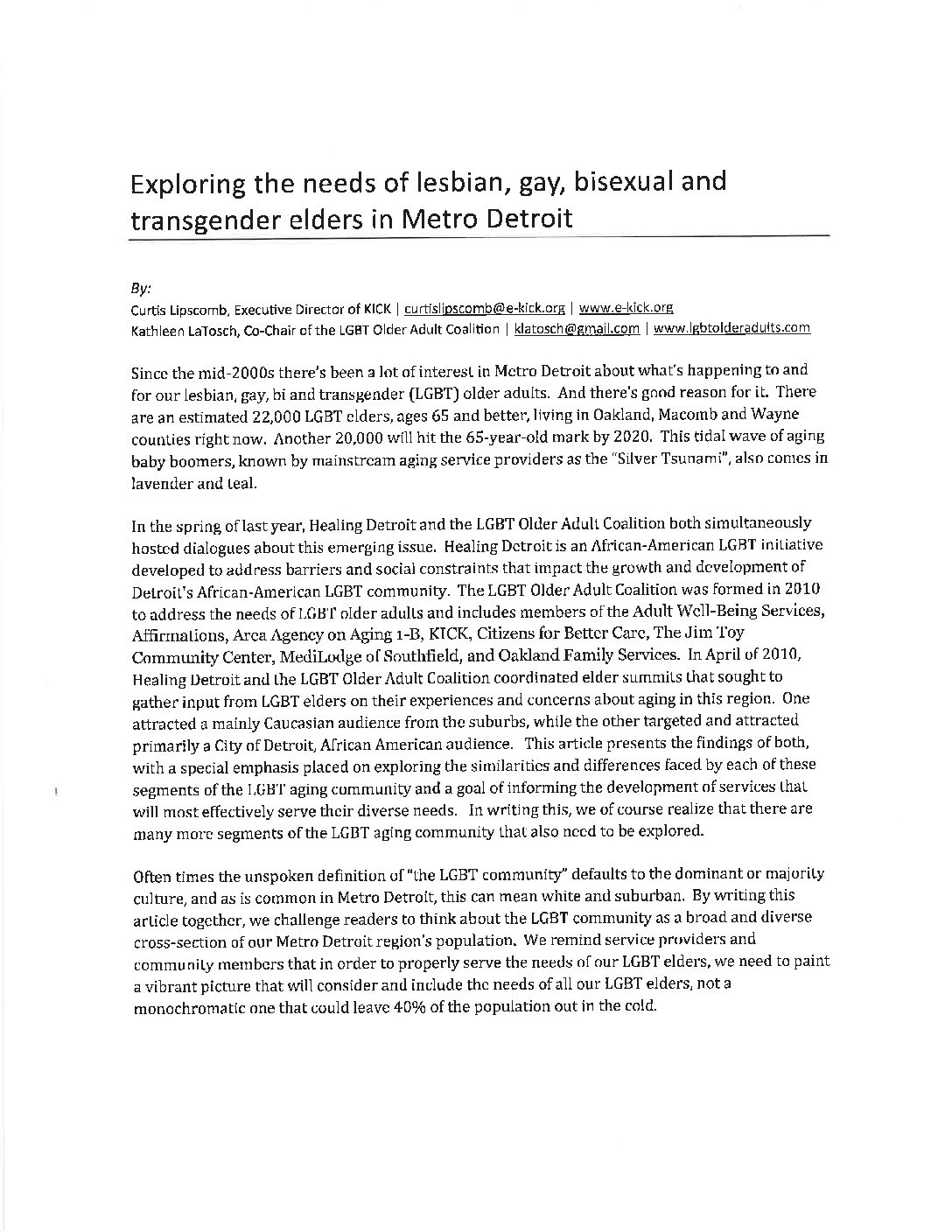 This article presents the findings of an elder summit held in Detroit in April of 2010. It places a special emphasis on exploring the similarities and differences faced by each of these segments of the LGBT aging community and a goal of informing the development of services that will most effectively serve their diverse needs.