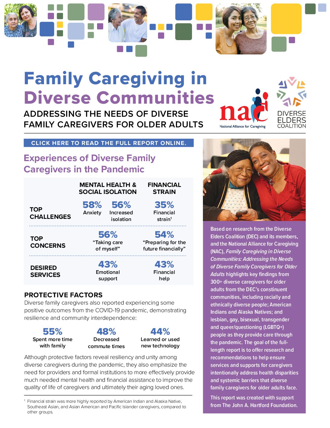 Based on research from the Diverse Elders Coalition (DEC) and its members, and the National Alliance for Caregiving (NAC), Family Caregiving in Diverse Communities: Addressing the Needs of Diverse Family Caregivers for Older Adults highlights key findings from 300+ diverse caregivers for older adults from the DEC’s constituent communities, including racially and ethnically diverse people, American Indians and Alaska Natives, and lesbian, gay, bisexual, transgender and queer/questioning (LGBTQ+) people as they provide care through the pandemic.