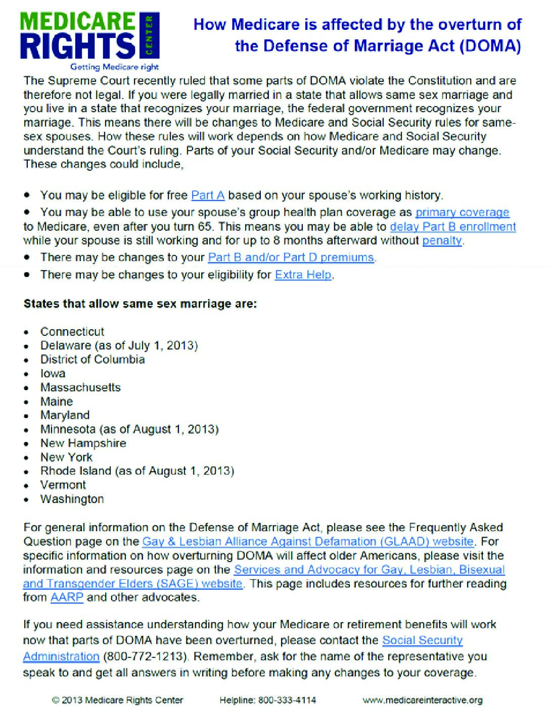 This fact sheet briefly describes how your access to Medicare may be affected if you are in a legal marriage, after the U.S. Supreme Court overturned the Defense of Marriage Act on June 26, 2013. It was developed by the Medicare Rights Center and has information that was current on June 27, 2013.