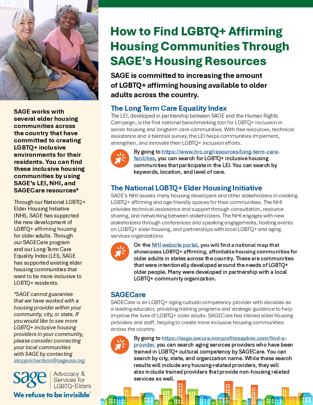 these inclusive housing communities by using SAGE’s LEI, NHI, and SAGECare resources.