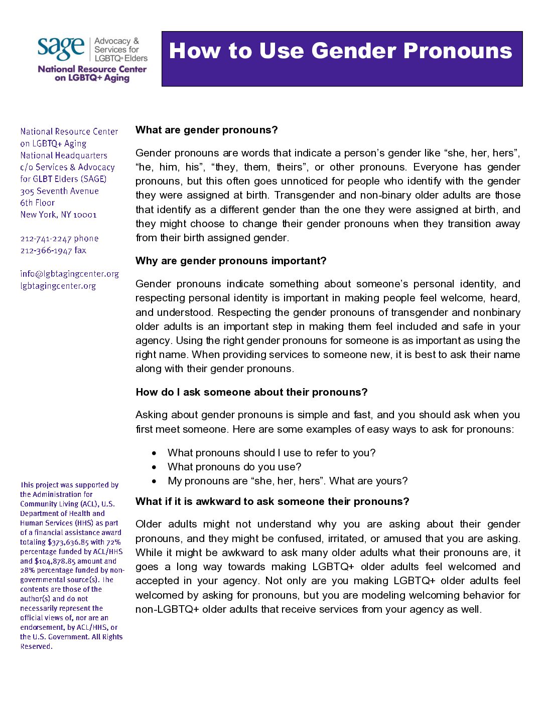 PDF Download How to Use Gender Pronouns June 27, 2024 | National Resource Center on LGBTQ+ Aging View PDF Synopsis This fact sheet describes the importance of gender pronouns and how to ask about the pronouns a person uses. View PDF Share Facebook LinkedIn Email Copy Link