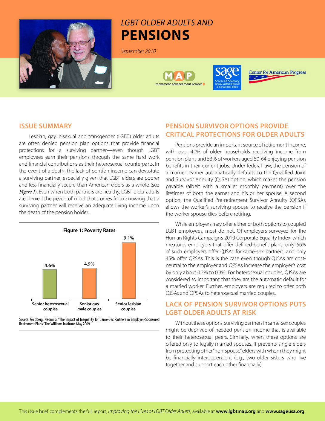 LGBT older adults are often denied pension plan options that provide financial protections for a surviving partner – even though LGBT employees earn their pensions through the same hard work and financial contributions as their heterosexual counterparts. The lack of pension income can devastate a surviving partner in the event of a death, especially given that LGBT elders are poorer and less financially secure than American elders as a whole. Even when both partners are healthy, LGBT older adults are denied the peace of mind that comes from knowing that a surviving partner will receive an adequate living income upon the death of the pension holder. One of eleven issue briefs based on the SAGE/MAP report Improving the Lives of LGBT Older Adults.