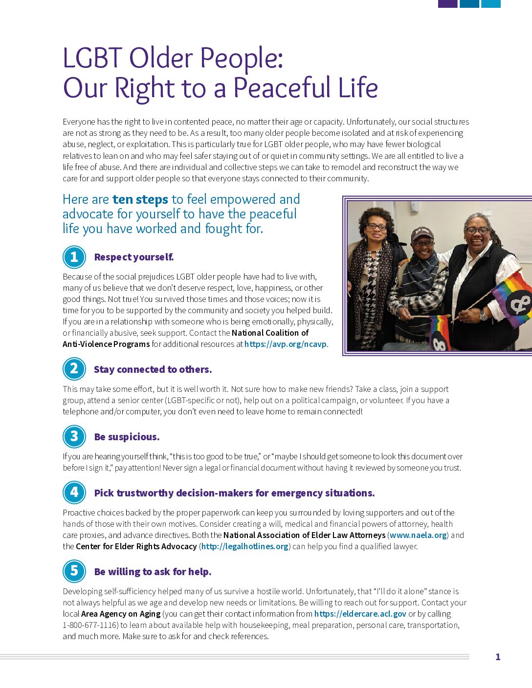 LGBT Older People: Our Right to a Peaceful Life provides steps LGBT older people can take to feel empowered and advocate for themselves.