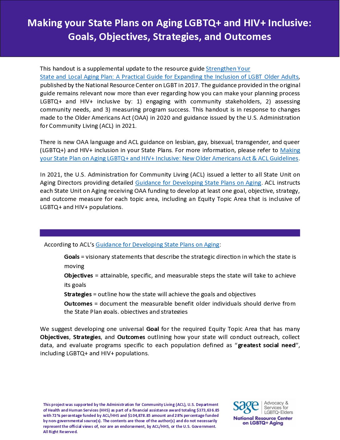 In 2021, the U.S. Administration for Community Living (ACL) issued a letter to all State Unit on, Aging Directors providing detailed Guidance for Developing State Plans on Aging. ACL instructs each State Unit on Aging receiving OAA funding to develop at least one goal, objective, strategy, and outcome measure for each topic area, including an Equity Topic Area that is inclusive of LGBTQ+ and HIV+ populations.