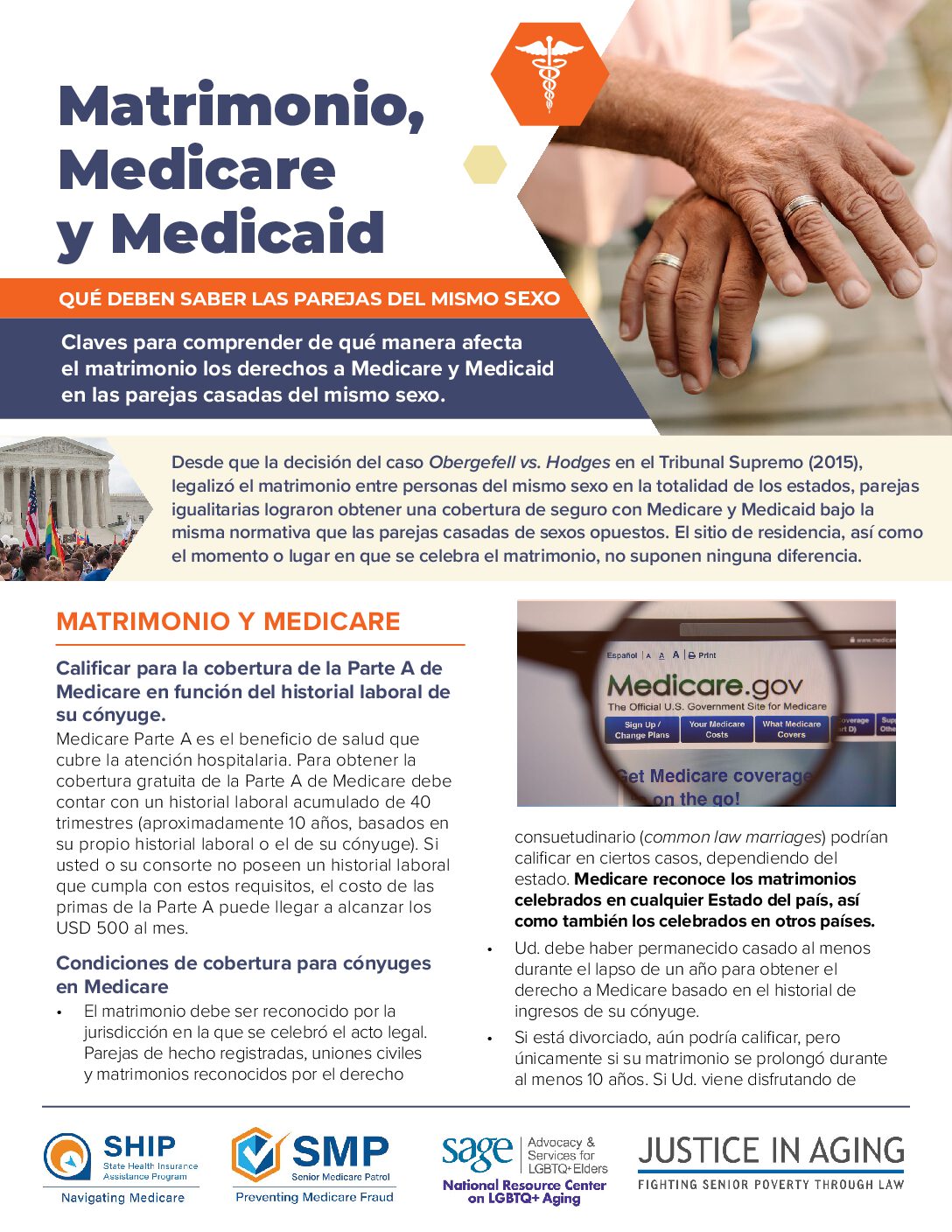 Desde que la decisión del caso Obergefell vs. Hodges en el Tribunal Supremo (2015), legalizó el matrimonio entre personas del mismo sexo en la totalidad de los estados, parejas, igualitarias lograron obtener una cobertura de seguro con Medicare y Medicaid bajo la, misma normativa que las parejas casadas de sexos opuestos. El sitio de residencia, así como, el momento o lugar en que se celebra el matrimonio, no suponen ninguna diferencia.