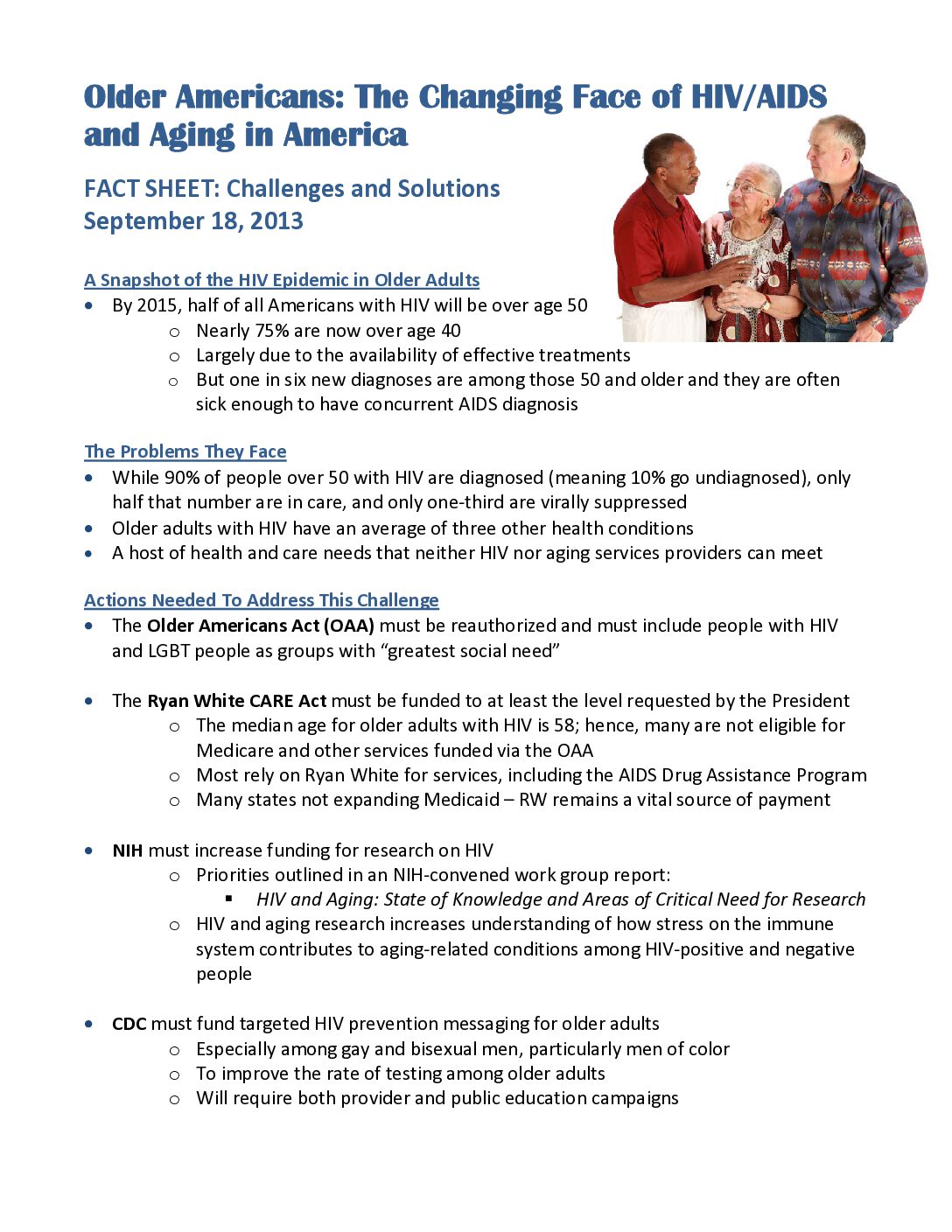 This fact sheet gives a snapshot of the HIV epidemic in older adults. It also points to problems they face and provides actions needed to address these challenges; among these actions is the Older Americans Act including people with HIV and LGBT people as groups with the “greatest social need.”
