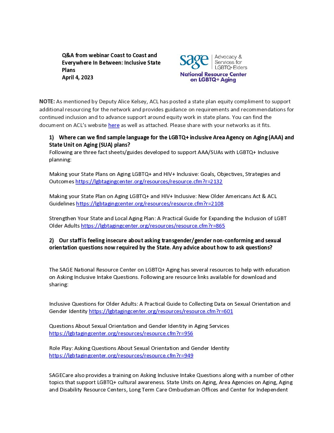 PDF Download Q&A Response and Resources Coast to Coast LGBTQ+ Inclusive State Plans June 27, 2024 | View PDF Synopsis Q&A Responses and Resources from recorded webinar, Coast to Coast: LGBTQ+ Inclusive State Plans. View PDF Q&A Responses and Resources from recorded webinar, Coast to Coast: LGBTQ+ Inclusive State Plans. View the recorded webinar here. Share Facebook LinkedIn Email Copy Link