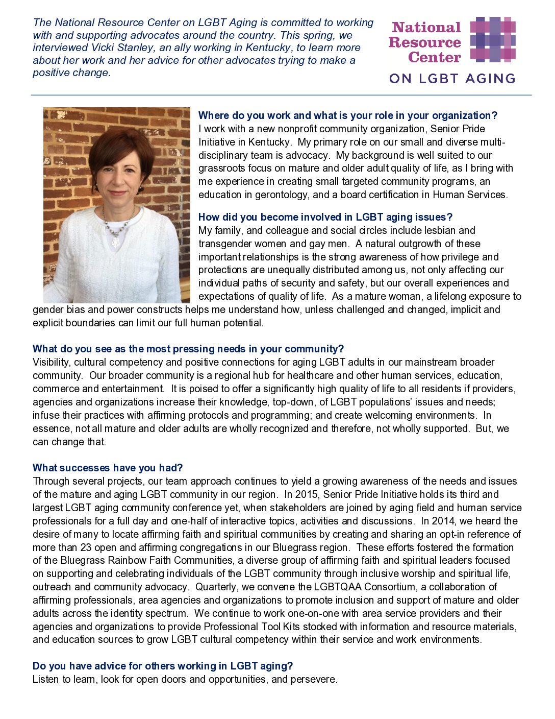 The National Resource Center on LGBT Aging is committed to working with and supporting advocates around the country. Please read this Q&A with Vicki Stanley, an ally working in Kentucky, to learn more about her work and her advice for other advocates trying to make a positive change.