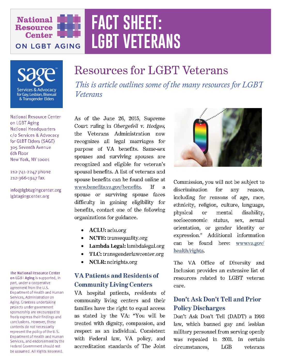 A resource document providing information to LGBT Veterans, spouses, caregivers and aging professionals.