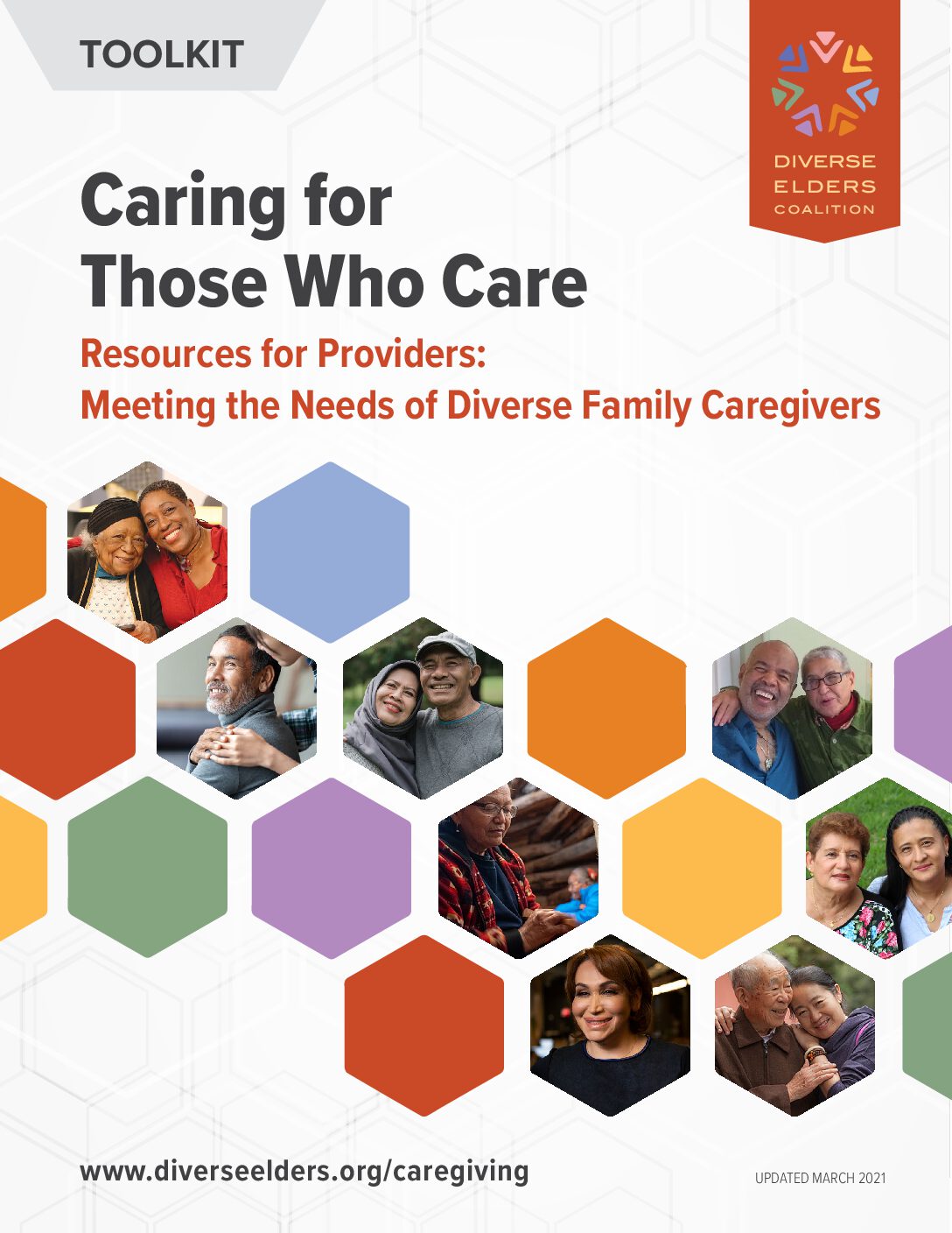 Download the Diverse Elders Coalition’s Resources for Providers: Meeting the Needs of Diverse Family Caregivers Toolkit. This toolkit offers topline information on what providers need to know, and key pieces from our comprehensive training curriculum, Caring For Those Who Care: Meeting the Needs of Diverse Family Caregivers.* Whether you’ve already attended one or more of our trainings, or this is your first time looking into what’s available to help you support diverse family caregivers, we think you’ll find these resources to be invaluable in building a more welcoming, supportive practice.