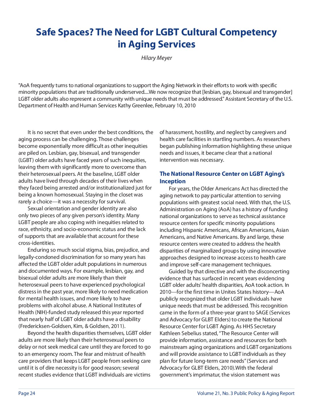 This article describes the need for aging services that are LGBT culturally competent and formation of the National Resource Center on LGBT Aging.
