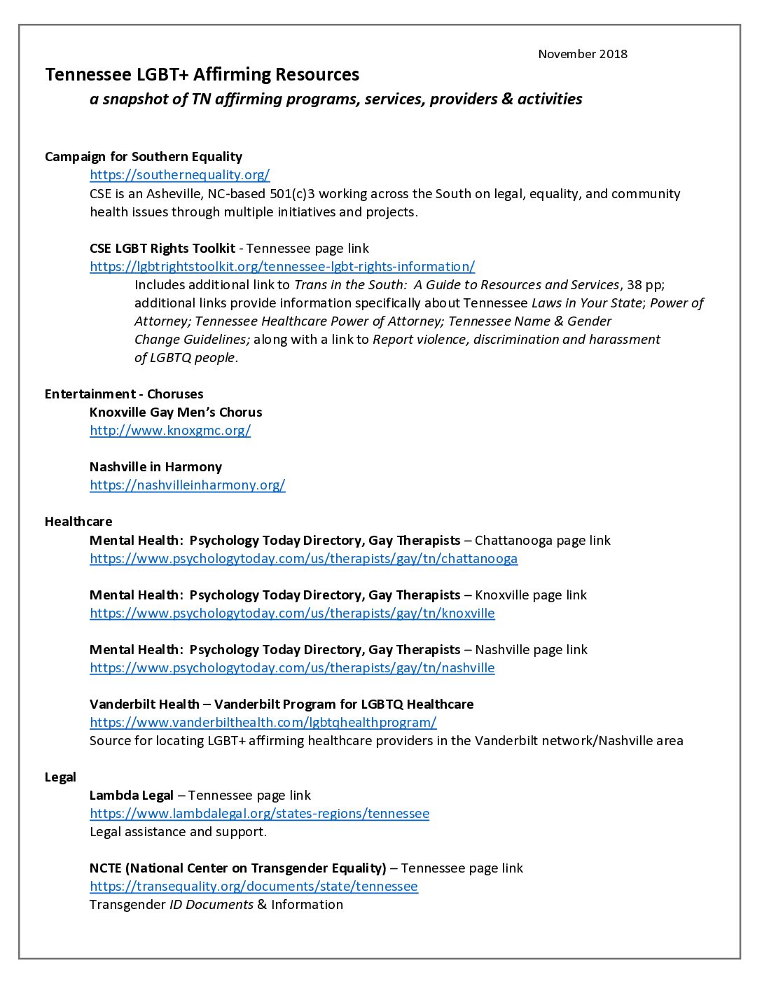 See this resource guide for a listing of LGBT+ friendly programs and services in Tennessee.