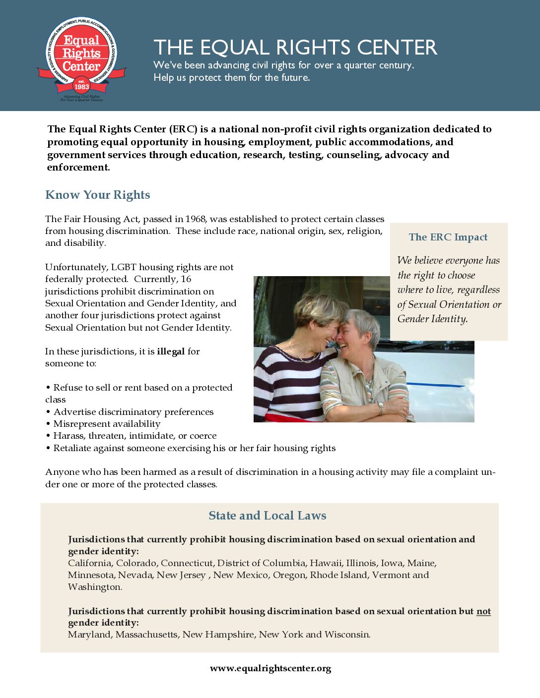 “Unfortunately, LGBT housing rights are not federally protected. Currently, 16 jurisdictions prohibit discrimination on Sexual Orientation and Gender Identity, and another four jurisdictions protect against Sexual Orientation but not Gender Identity.”
