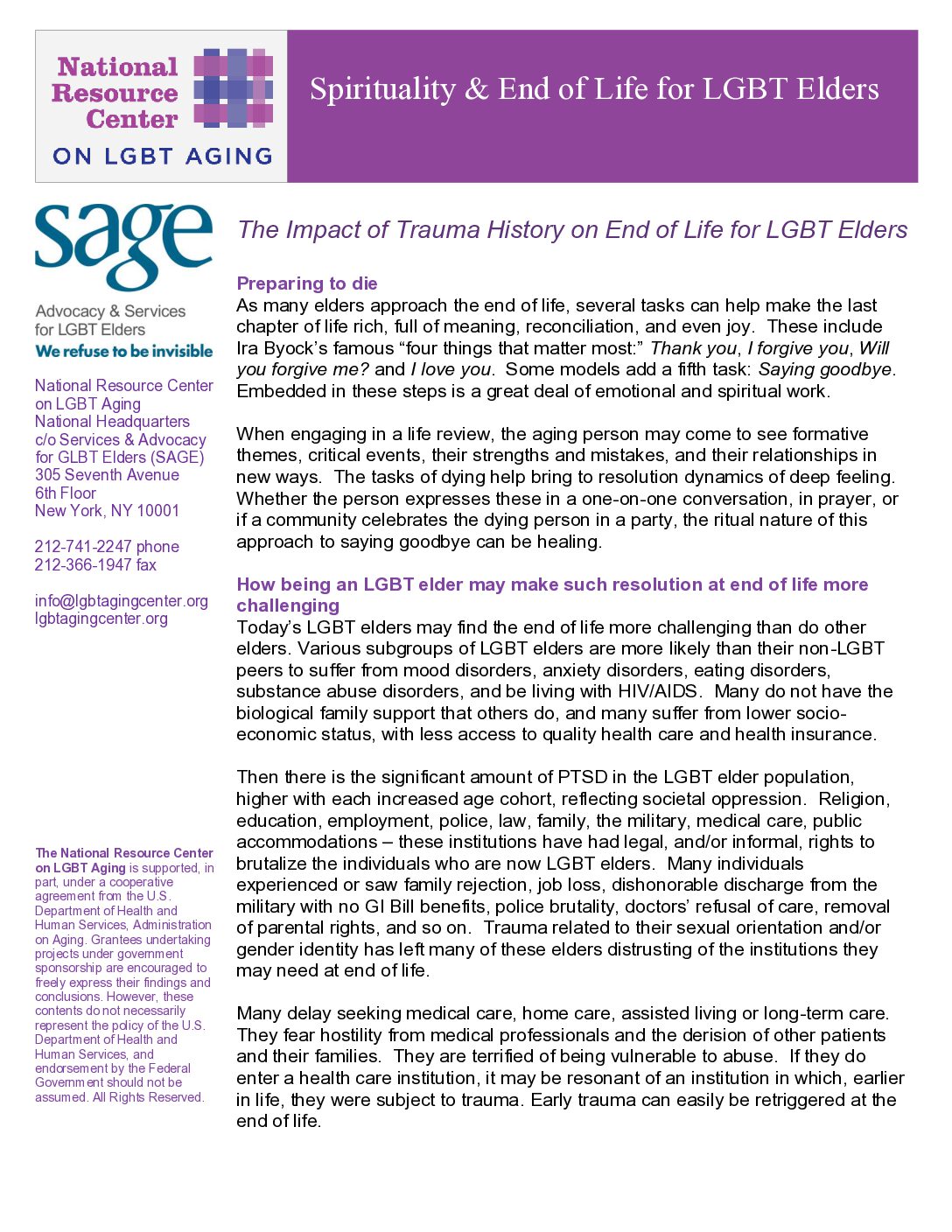 This fact sheet provides an understanding of how a history of trauma may impact end of life spiritual support for LGBT elders and suggestions for professional caregivers.