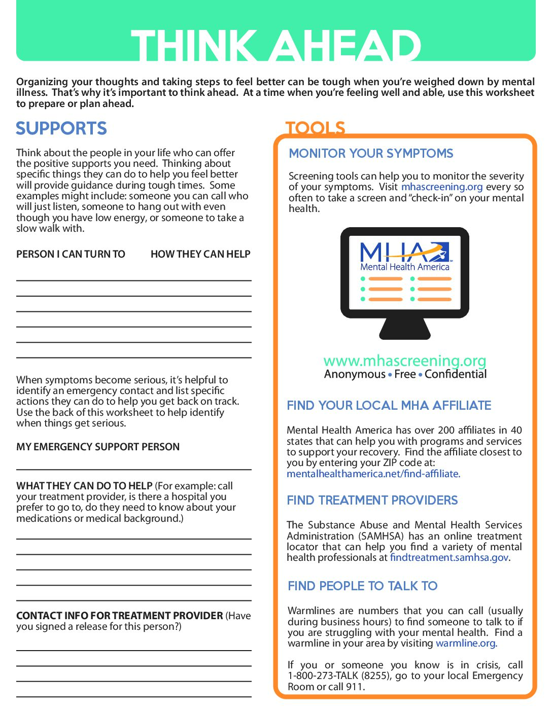 Organizing your thoughts and taking steps to feel better can be tough when you’re weighed down by mental illness. That’s why it’s important to htink ahead. At a time when you’re felling well and able, use this wroksheet to prepare or plan ahead.