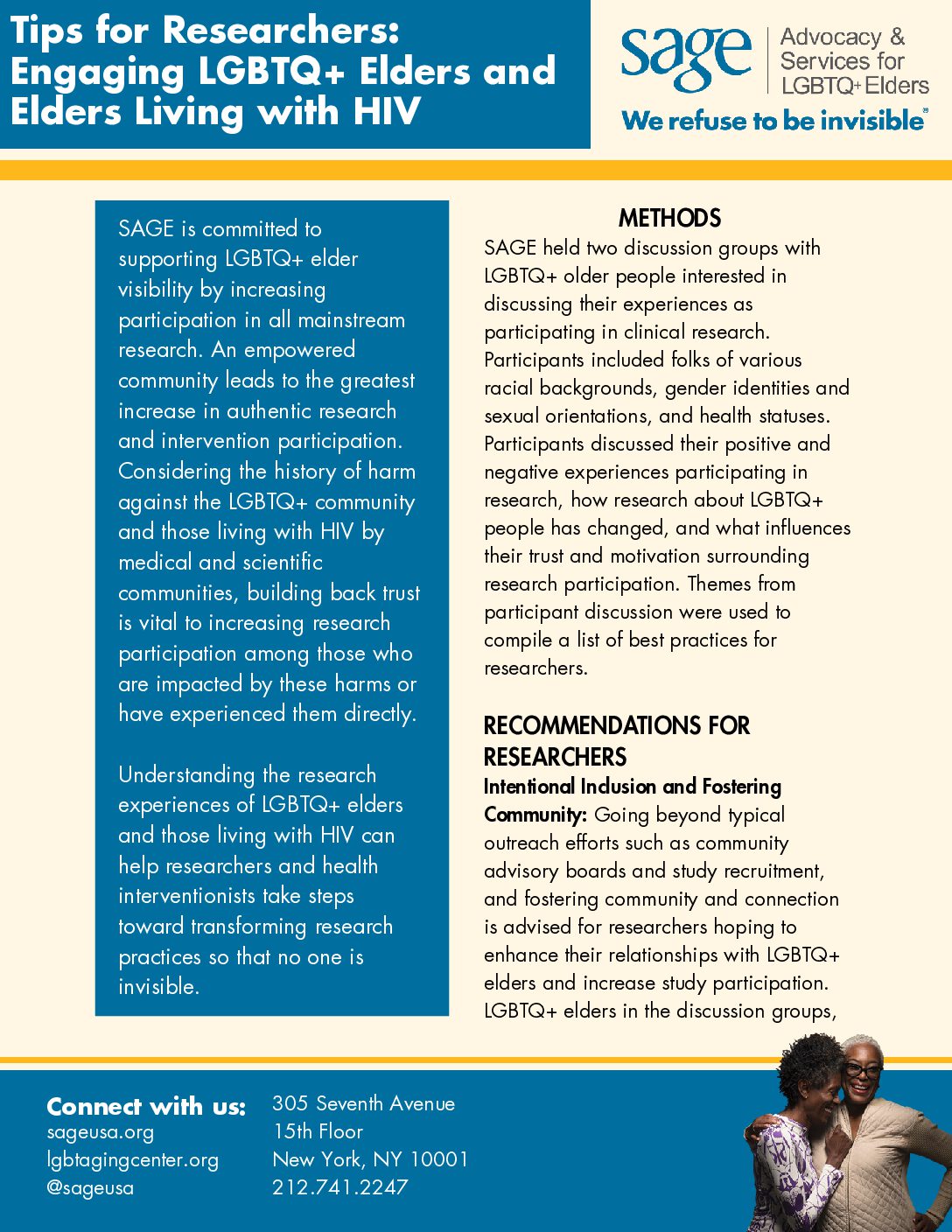 This tip sheet covers insights from diverse LGBTQ+ elders and elders living with HIV on engaging community members in research.